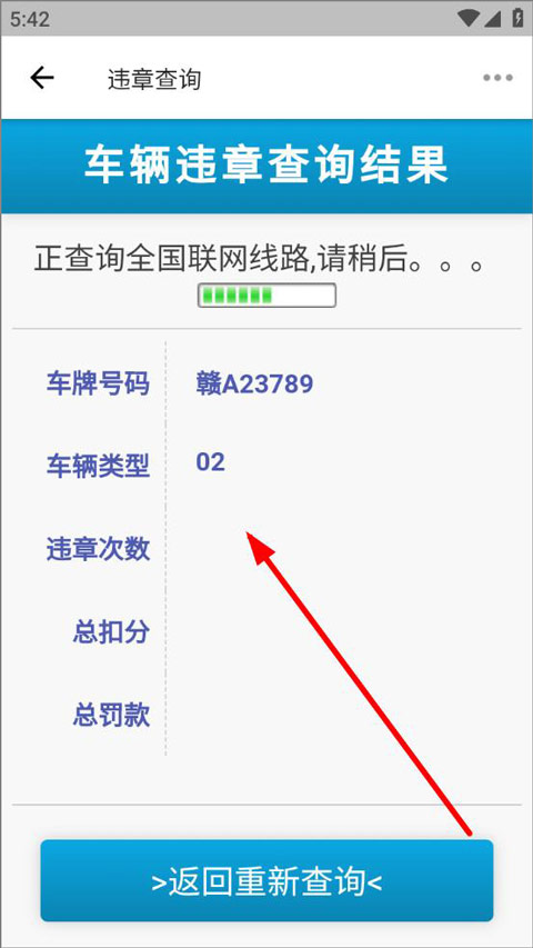 4、通过全国联网线路查询后,用户可看到哦查询结果(车牌号、车辆类型、违章次数、总扣分、总罚款)。