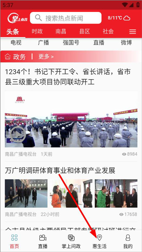1、打开掌上南昌app登录进入首页,首页是关于南昌本地的相关新闻头条,用户可查看南昌时政、社会新闻,点击惠生活;