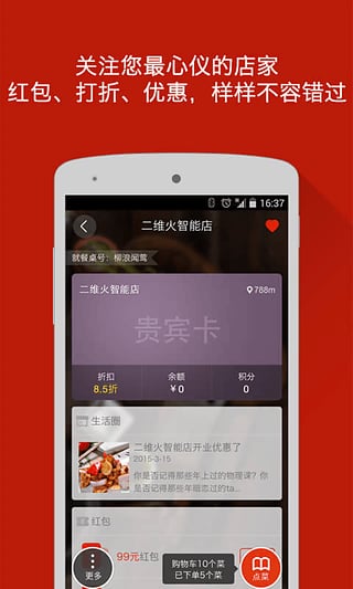同时二维火的会员卡功能,还可以享受优惠和折扣,积分兑换等活动,让你吃得更加带劲,不仅享受到优质服务,而且让你吃得更加省钱哦!