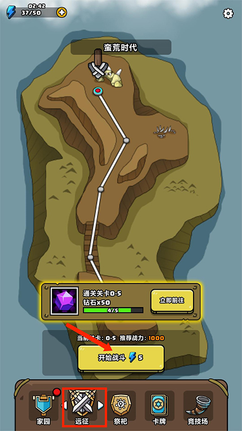 1、打开原始人别嚣张游戏,进入游戏主界面,包括【家园】、【远征】、【祭祀】、【卡牌】以及【竞技场】等玩法,