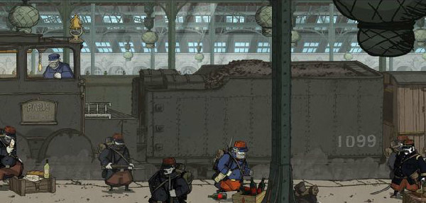 4、下一个场景我们的目标是要登上列车之上,但是梯子有士兵阻挡,在这名士兵旁边有一个军乐队,按照“2-4-3-1”的顺序与乐手对话,士兵就会自行离开【收集品5】,最后在车顶之上往左走,拉动另外一个链条机关赶走另外两名士兵即可。