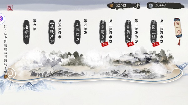 游戏中目前供设置了两种闯关类的玩法,第一种是体验经典三国故事,破解棋局类型的三国纷争,在这个玩法中,你可以操纵系统提供的棋子,来破解经典的棋局。而第二种闯关玩法则是以武将故事为背景展开的武将列传,难度更高,可以使用自己搭配的武将进行攻略,回合制的模式,让高难度的AI变得十分难缠,相信你一定能在这里体验到烧脑对弈的乐趣!