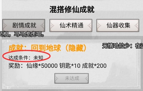 其中有一个非常醒目的隐藏成就,叫作“回到地球”,也是目前游戏中奖励最丰厚的成就,但是这个成就的完成条件却是未知。因为在《混搭修仙》中,玩家所扮演的角色是从地球穿越过去的修仙者,因此有人猜测是不是需要成仙后才能完成,可是有人成仙后依然没有完成这一成就,可见其神秘程度。