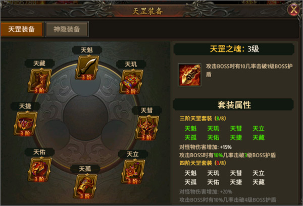 天罡装备套装可以增加对野怪的伤害,是破BOSS护盾的必备装备,激活的套装品阶越高,能击破BOSS的级别越高。天罡装备主要是在神秘宝库用罡魂兑换,宝库分三种级别,不同的级别所能换取的天罡装备级别不同,三种级别的罡魂都能通过击杀远古BOSS获得。注:低阶的天罡装备可以合成高阶的天罡装备。