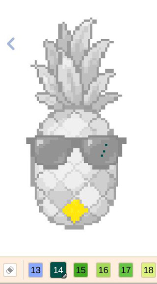 1、两指向外滑动,放大图片,可以细节的看见每个色块上的数字,每个数字对应了下方的颜色块。2、用手指点击选中当前涂色颜色块,然后在绣样对应的数字色块上填充。担心误碰到其他数字块吗?不用担心,错误的填色会有数字提示。