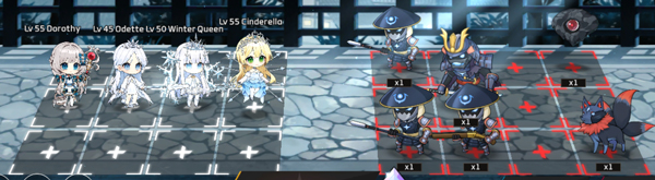 在敌方没有击退角色的情况下,站位如图所示,1排弓箭手,2排法师,3排近战,最后治疗。