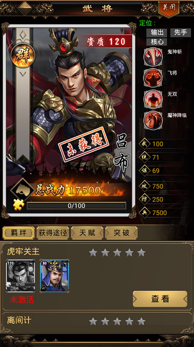 3、骑兵:分为输出和爆发型武将。以吕布和关羽为例,属于爆发型武将。技能1,鬼神斩:对敌方全体目标造成220%以上的攻击伤害,技能等级越高伤害越高。技能2,魔神降临:击杀敌方后获得霸体效果。获得免疫控制技能等效果,技能1提供了持续爆发的可能。是强大的秒人武将,技能2又提供了无敌的免疫机制,简直是既能打又能抗。