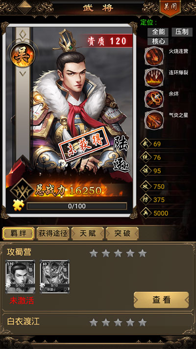 4、枪兵:分为先手和控制。以陆逊为例,属于法攻群攻型武将。技能1,火烧连营:对敌方全体目标造成190%的法术伤害,并有灼烧效果持续对敌方造成伤害。技能2,气炎之星:陆逊不会受到自身兵力上限的5%的伤害。所以这类武将对战斗后期残血的敌人很有威胁,很有可能会被一招团灭。