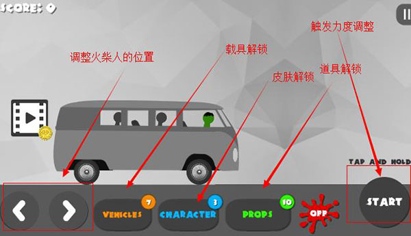 先来说说游戏的玩法,其实很简单,进入关卡后玩家只要尽最大努力让火柴人受到更加严重的伤害即可,在火柴人受伤的过程中,游戏会根据受伤程度赠与玩家游戏币,受伤越严重,得分越高。