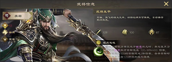 关羽能够利用技能刀斩青龙伤害直线上的敌方目标,技能释放后自身伤害提高。在武圣之血加成下,还能将伤害转化为自身兵力,同时有几率提高伤害。一旦关羽受到控制,直接扣除自身兵力为代价解除所有负面效果,提高攻速,所以关羽是非常不怕控制,一个冲锋进去之后尽情收割。
