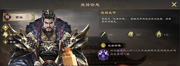 曹操的技能宁负天下,对敌方全体造成一次攻击,并且附加眩晕效果。当血量低于20%时会直接回到阵容后排持续回复兵力。技能盛世英雄,在自己掉血的同时还会对敌方全体造成伤害加眩晕。辅助技能威武之师,开启战斗后直接提高近战武将的移动速度和攻击力加成,目前阵容中我方有三名近战武将,能够充分享受到曹操带来的提升。