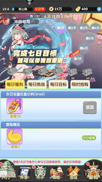 七日登录福利主公通过完成七日福利活动可获得海量道具奖励;