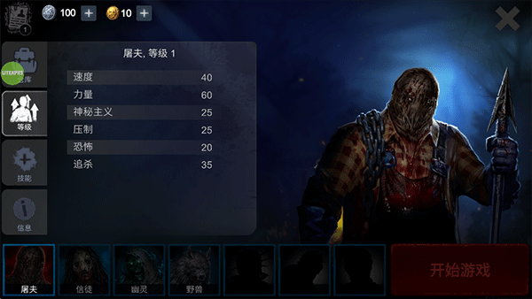 2、在这里我选择的是扮演疯狂杀手模式,你可以选择屠夫、信徒等角色,每个角色的各项面板都不一样