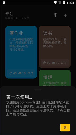 3、当然你也可以点击右上角的“+”图标新建一个专注事项;