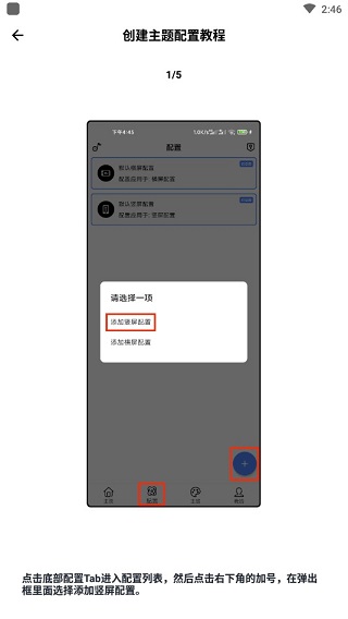 一、主题教程1、点击底部配置Tab进入配置列表,然后点击右下角的加号,在弹出框里面选择添加竖屏配置。