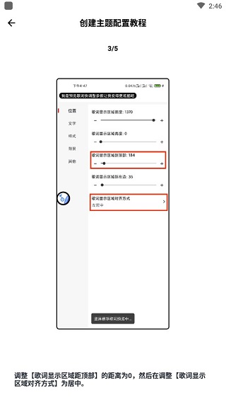 3、调整【歌词显示区域距顶部】的距离为0,然后在调整【歌词显示区域对齐方式】为居中。