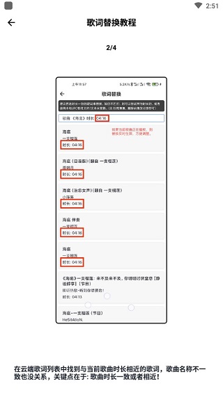 2、在云端歌词列表中找到与当前歌曲时长相近的歌词,歌曲名称不一致也没关系,关键点在于:歌曲时长一致或相近!