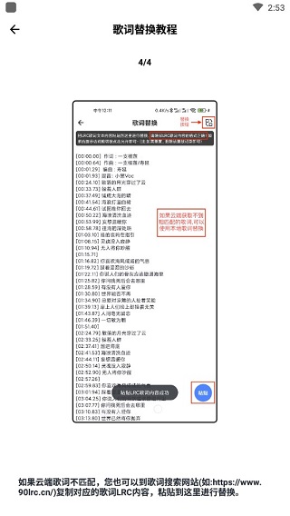4、如果云端歌词不匹配,您也可以到歌词搜索网站复制对应的歌词LRC内容,粘贴到这里进行替换。