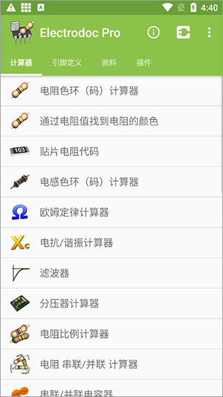 这篇文章主要介绍了ElectroDroid(电路专家)这款专业级的电路参数辅助软件。它是一个强大的工具,专为电子专业的学生和相关从业人员设计,提供了丰富的功能和数据资源。软件涵盖了电阻色环解码、SMD电阻代码、电感色环解码等基础学习功能,还配备了欧姆定律计算器、分压器计算器、电压降计算器等一系列实用工具。