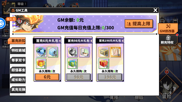 1、开局送GM刷充特权、SSR角色
