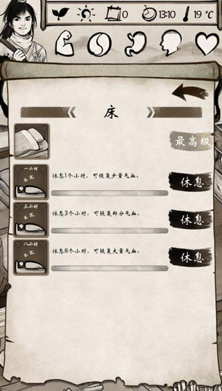 先建造厨房酒害和桌子床这几个必需品,再建造药箱、锻造台。前期可靠打兔子和狼来升级同肘积累资源肉,靠造酒来恢复精神,解锁第二幸后田归农有几率掉落酒,没有获得好裝备的肘候可通过提升造台来制作高等级武器和装备。冬季会吏冷,气温降低会影响角色属性的消耗,一定要造暖炉!夏天就不要点暖炉了,温度高了会加速外伤消耗。
