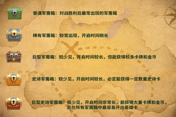 1、玩家的卡牌和金币几乎都是来源于各类军需箱中,今天我们就带来了游戏内各个军需箱的资讯内容,供各位小伙伴进行了解。2、游戏里对战胜利后有机会获得5种军需箱,按照获得几率从高到低分别为:普通军需箱、稀有军需箱、巨型军需箱、史诗军需箱、巨型史诗军需箱。而除了对战胜利之外,还有4种军需箱是通过另外的途径获得的。