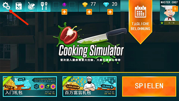 1、打开料理模拟器游戏,进入游戏主界面,选择左上角【齿轮】图标,