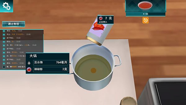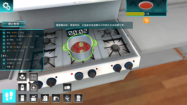 画面也很棒,3D建模让整个厨房看起来超真实,锅碗瓢盆的声音、食物的变化都特别逼真。教学也挺详细,哪里不会点哪里就能解决。不过玩的时候要注意,大盘上菜可能会挤出食物,这点有点尴尬。