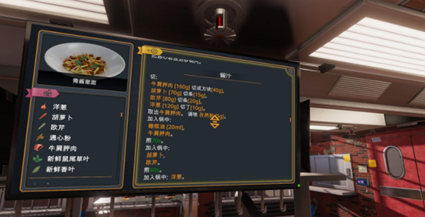 2、菜肴制作,根据客人的订单进行制作,有详细的制作顺序说明,第一次可能会觉得复杂,但多重复几次基本上就默认能记住大概的流程了。从按需拿取对应重量的食材到各食材的精心加工,再到最后的装盘点缀,其制作的过程可谓十分真实,几乎都应用了真实的物理原理,举几个例子,像是切菜需要按照要求进行等份质量的切取,像是煎肉一段时间后需要拿着铲子进行翻面,像是给食物上调味料需要对准对应的位置等。