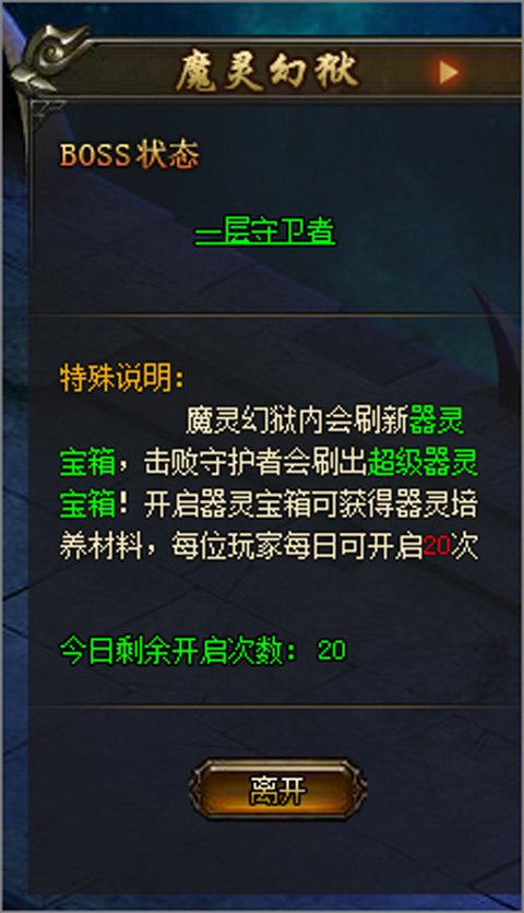 4、魔灵幻狱内每天可以开启20次器灵宝箱。
