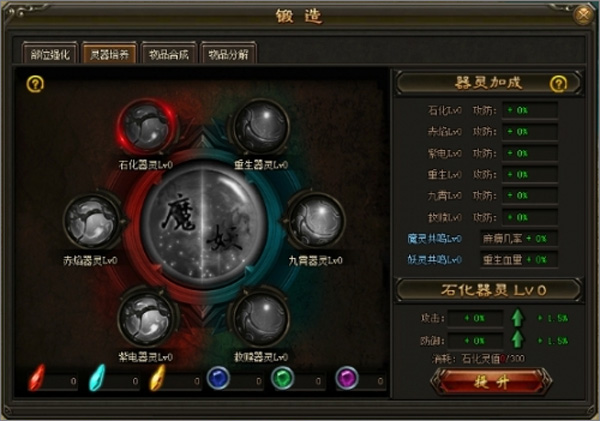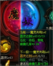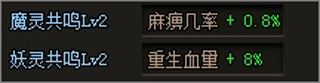 1、同时将石化、赤焰、紫电器灵等级提升至5/10/15/…/40。可触发“魔灵共鸣”,魔灵共鸣提供特殊属性“人物麻痹几率”加成。无需佩戴妖器即可生效。