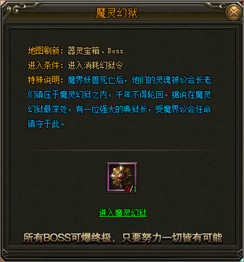 进入魔灵幻狱特殊地图后,玩家会发一些器灵宝箱,及幻狱守卫BOSS;