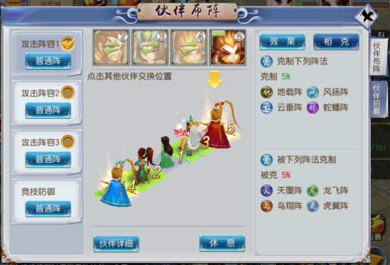 玩家可以设置阵法,包括“攻击阵法”和“防御阵法”,根据玩家不同需要设置相应阵法,方便玩家随时根据不同情况切换。