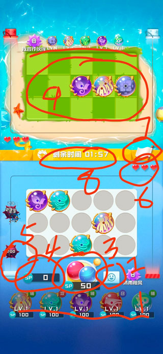 1、你带的球球阵容。和对手带的球球阵容。就是红色的横线标注出来的那两个,关于阵容下面会讲到,这里略过,