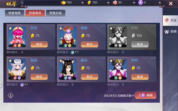 玩家可以在妖鉴商店中使用金色妖石购买自己所需的妖鉴,如果没有自己所需要的妖鉴可以选择刷新来得到更多选择。