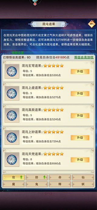 2、最喜欢的点化道果环节:准圣以后可以花费1000点玄黄+2点鸿蒙原液,将道果点化,属性翻倍(不限制道果本身的等级,几级都可以升,效果一样)。