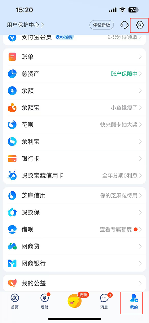 1、首先打开【支付宝】客户端,然后点击右下角【我的】,点击右上角【设置】图标。