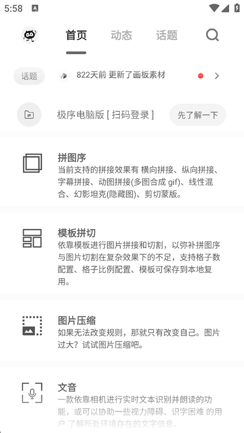 极序app是一款多功能免费工具箱手机应用。其内部汇聚了超过15中常用功能,包含多个小工具,例如图片裁切,图片分割,图片压缩,噪音测试,视频转动图,轻画板,随机工具,模拟通知,文本处理,二维码制作,倒计时工具,文字图制作等,无论是拼图,还是图片切割,压缩,随机数生成等都可以轻松搞定,并且每个工具都有详细的使用方法介绍,轻松的满足用户使用需求。此外,极序app还非常人性化的适配了夜间模式,给予每位用户24小时的优质体验。欢迎感兴趣的用户前来本站下载体验。