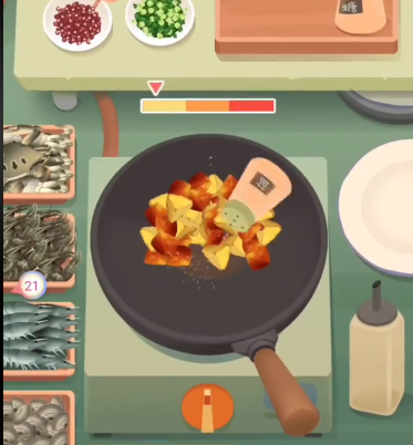 5、在上方调味区域中,往锅中加入适当的量,箭头到进度条中间即可。