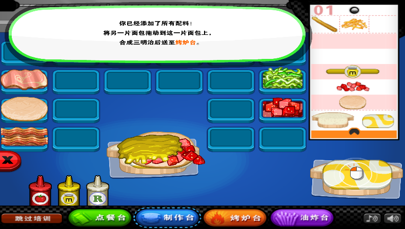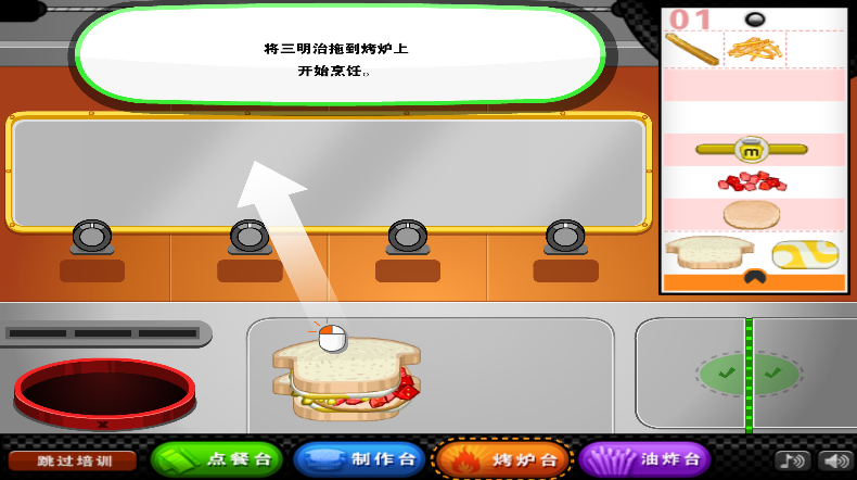3、进入制作台,按照顾客要求选择正确的食材。例如:我这位顾客要的是吐司面包三明治,所以先在一堆面包中选择吐司面包。