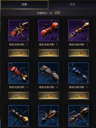 想要轻松拿到紫色蚂蚁吗?——那就要注重完成物竞天择活动,可以用完成任务所积攒的积分进行兑换,快速获得心仪的紫色蚂蚁~