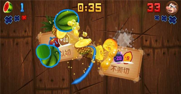 游戏的操作极为简单,屏幕上会不断跳出各种水果——西瓜、凤梨、猕猴桃、草莓、蓝莓、香蕉、石榴、杨桃、苹果、火龙果等,玩家看到抛出的水果看准用手指在屏幕上移动划过去,就可以像忍者战士一样痛快地斩开水果了,在它们掉落之前要快速地全部砍掉;