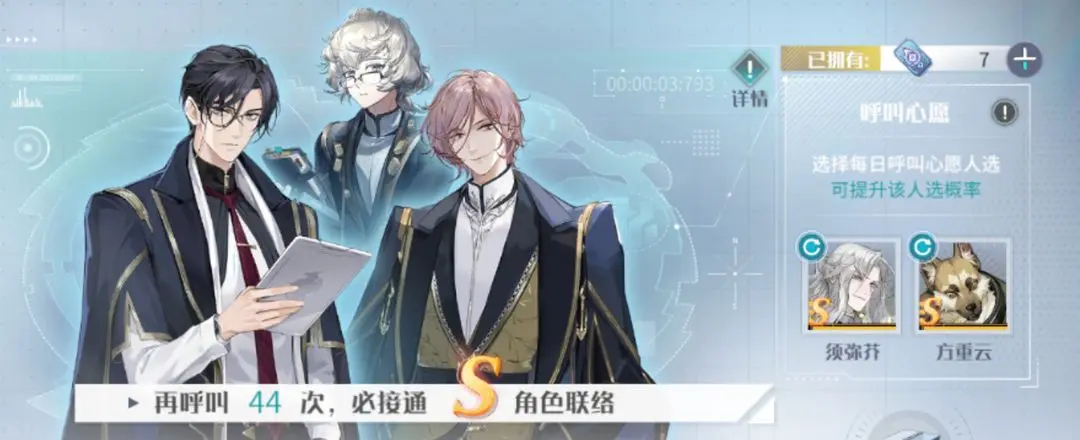 1、通过呼叫许愿,可以提升2名S级角色获取的概率。许愿每日凌晨5点重置,重置后可更换其他角色提升获取概率;