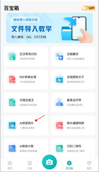 1、下载后打开进入app,点击百宝箱,这里有很多的功能,点击选择“AI修复照片”