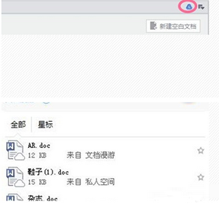 8、如果进入的是文档处理界面,点击右上面的云朵标识,在文档那个漫游文档下面可能可以找到加入收藏的云文档。使用这种方法时要求至少在手机上打开过该文档。