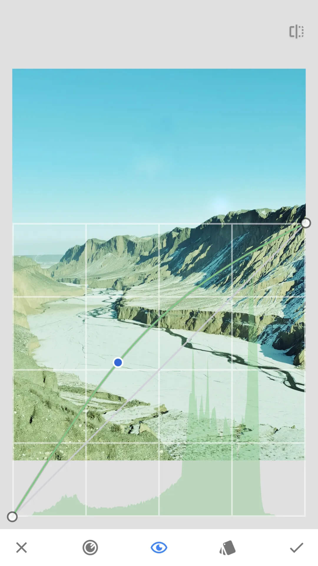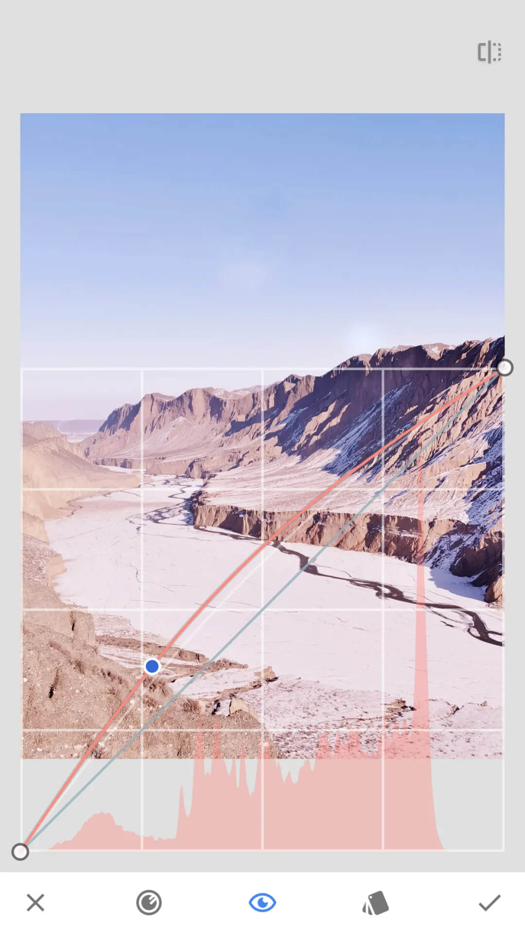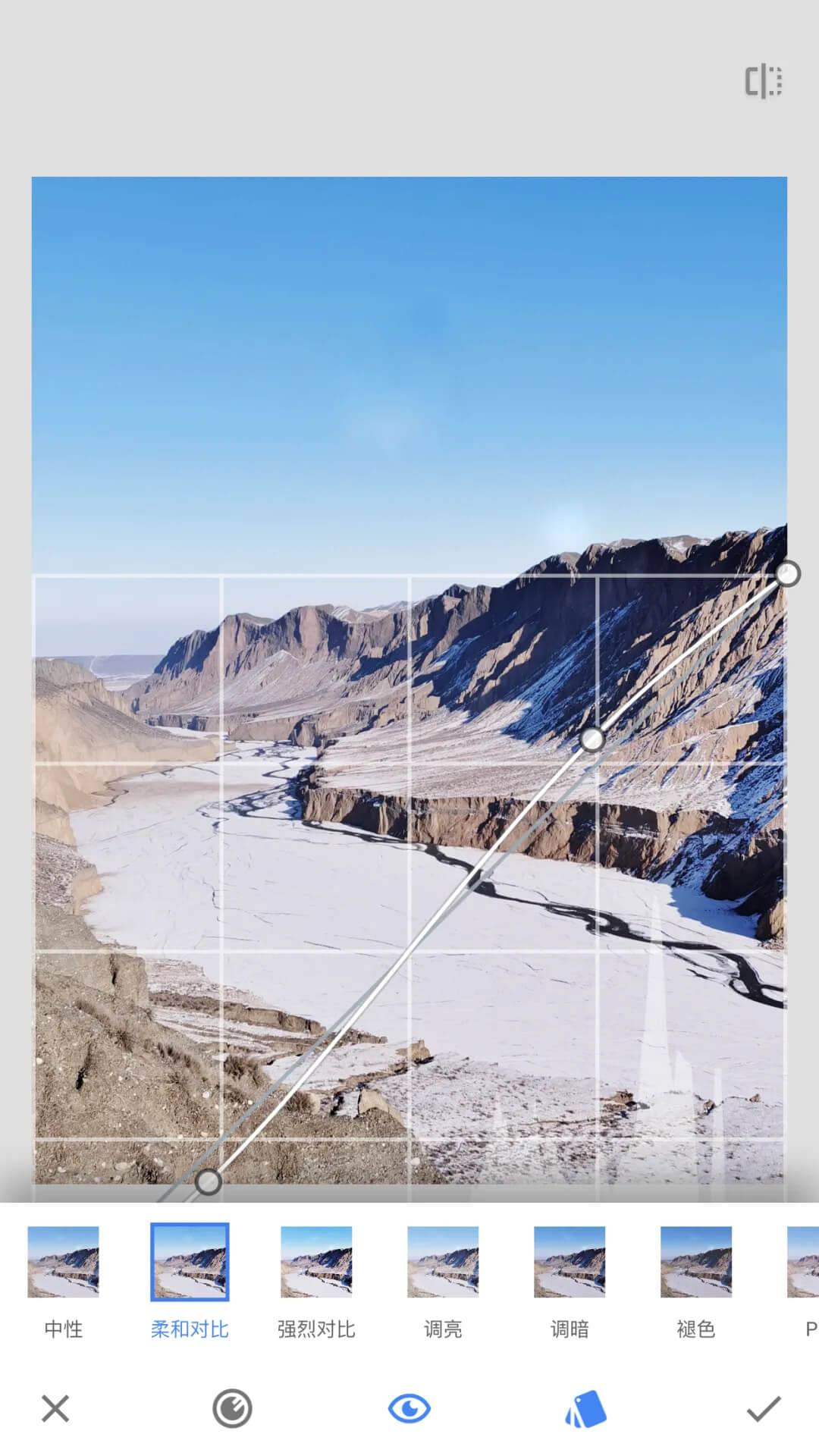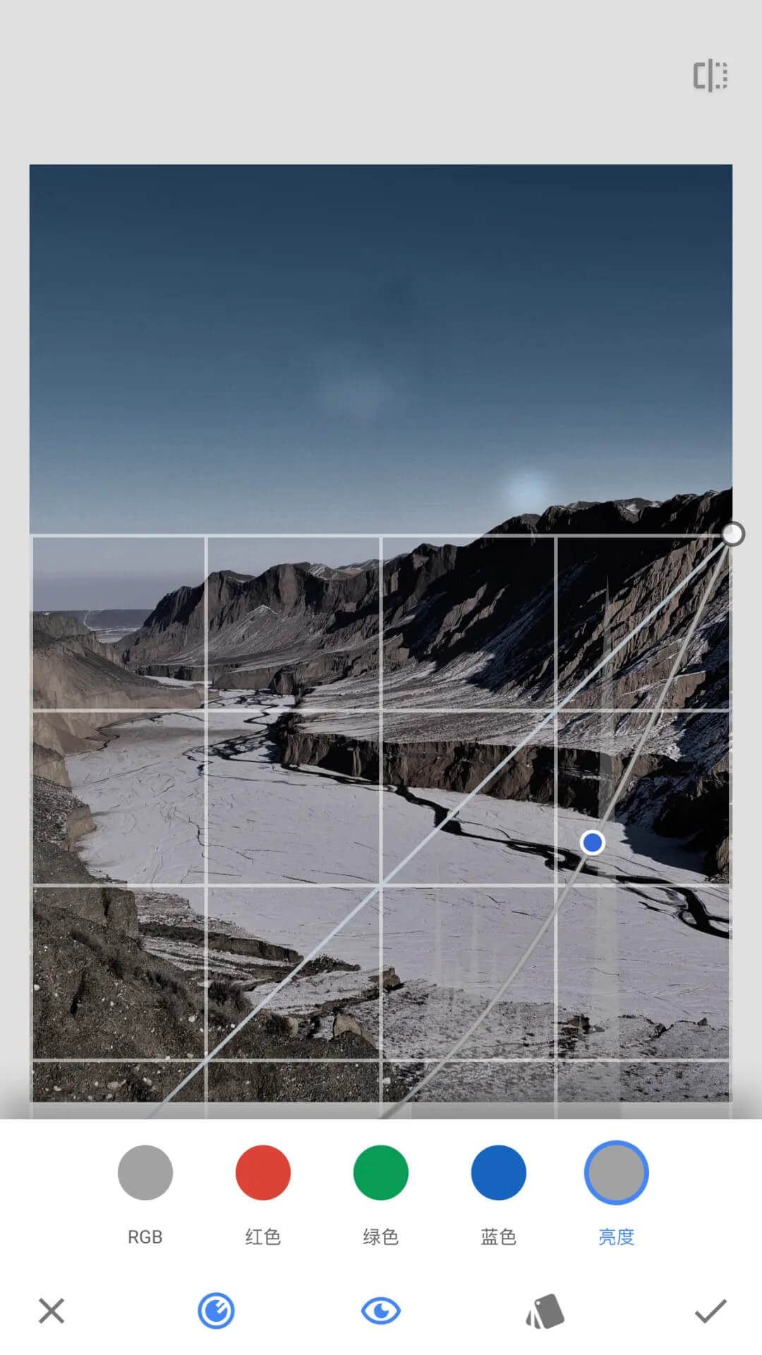 ② RGB曲线:点击底部最左侧菜单,即可看到5条曲线选择的按钮,首先就是RGB曲线,它主要的作用是提亮或压暗画面曝光,提升或降低画面的对比度。可以针对画面全局进行调整,也可以分别针对画面的暗部、中间亮部和亮部进行调整。如果要提升或者压暗整体画面的曝光,只需在曲线的中间打1个锚点,再按住锚点往左上角拉动即可提升整体画面曝光,往右下角拉动,则整体曝光降低。