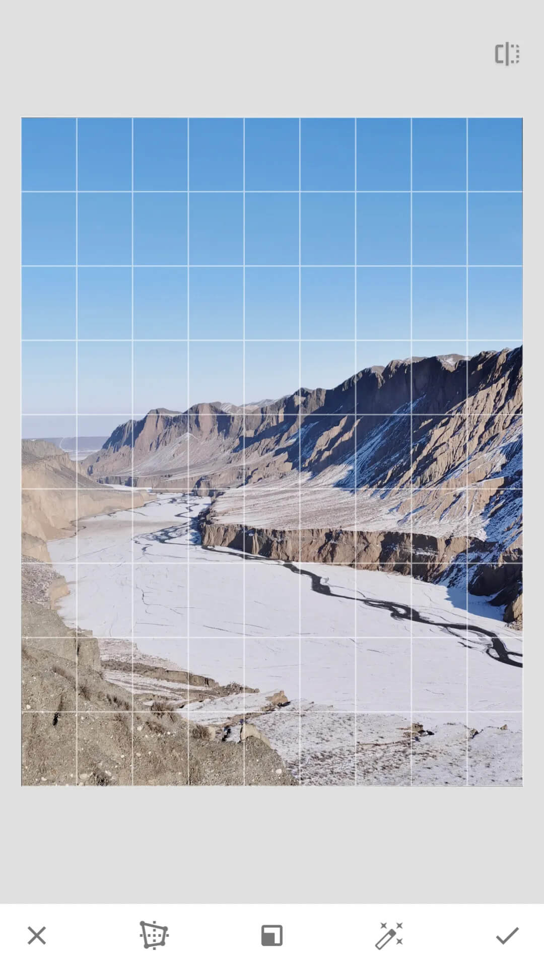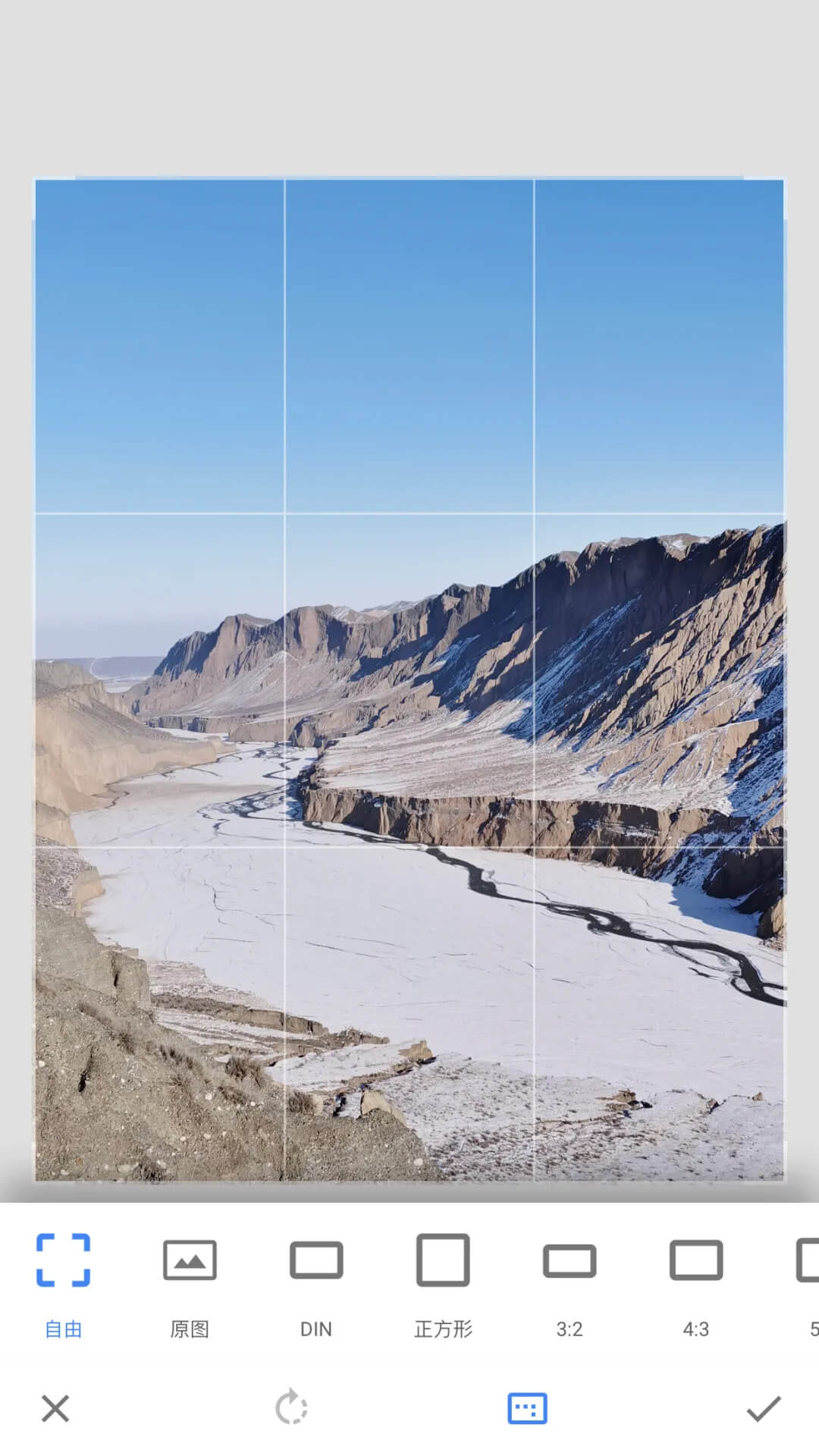 裁剪:主要是对画面进行裁切,如果照片拍摄到多余的前景或背景,通过裁切画面能够获得更好的构图,这里可以自由裁切,也可以选择下方的裁剪比例进行裁切。