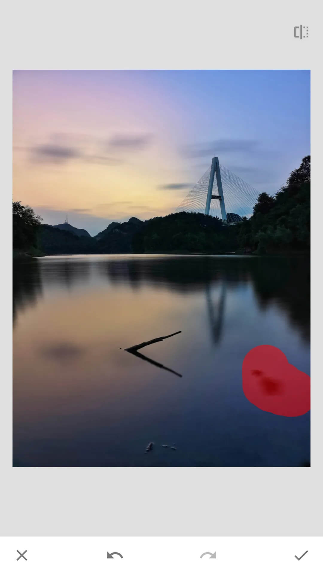 修复: 主要作用是处理画面中的杂物和污点,对于比较小的背景杂物处理还不错,但是对一些比较大的背景杂物处理就不够好了,处理得不够干净,画面会留有痕迹,处理效果不如专门的杂物修复软件TouchRetouch。在进行杂物清除时,直接对背景杂物进行涂抹即可,若背景物比较混乱,可以用两个手指放大照片至最大,然后再一点点涂抹杂物进行清除。