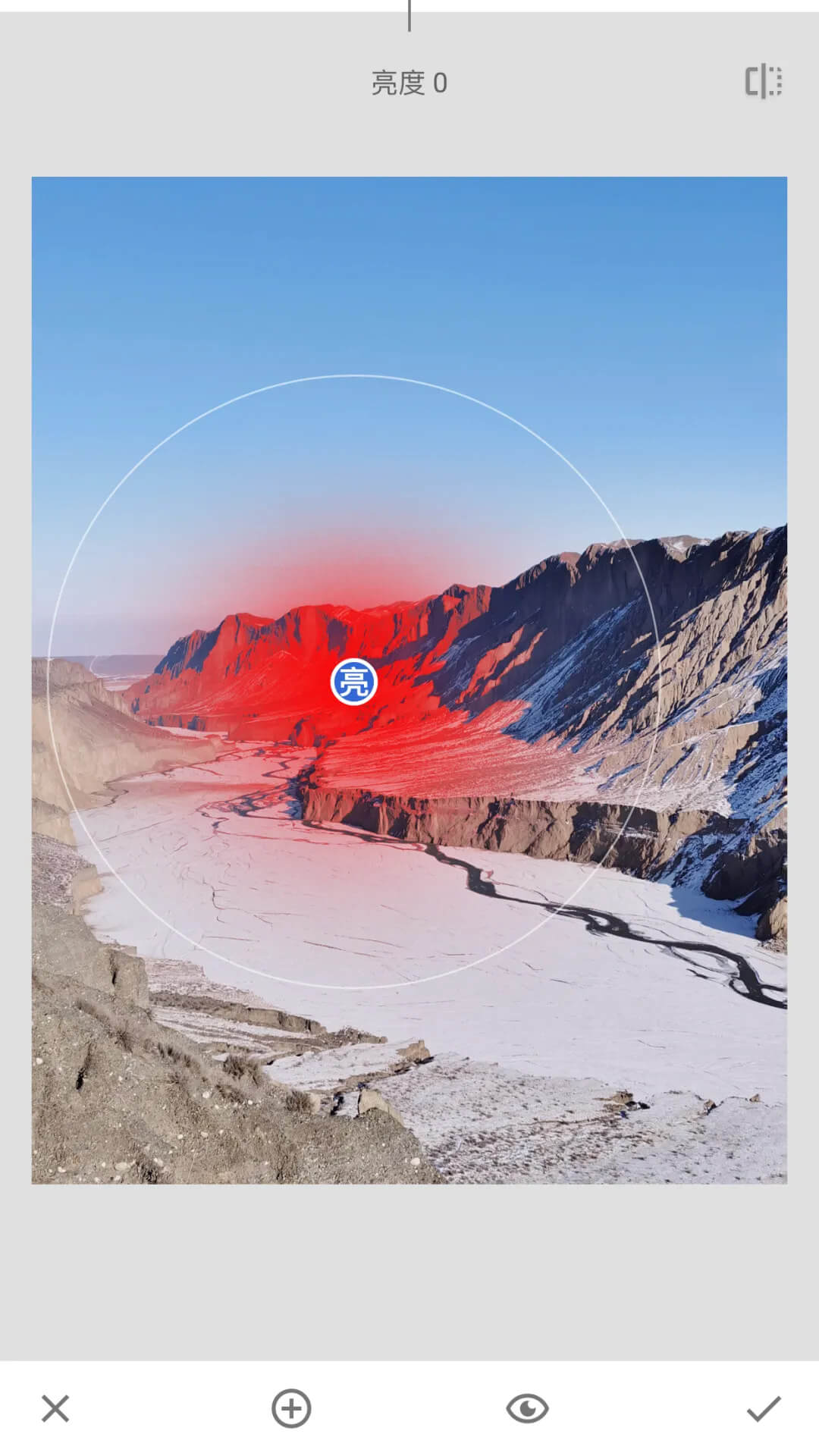 局部工具主要能够调整4项参数,亮度、对比度、饱和度、结构,它的调整原理是,我们点击照片中想要调整的某个区域,即出现一个调整圆点,上下滑动画面就会出现4个调整参数;用两个手指滑动画面,会出现一个圆框,圆框内的红色区域即表示【局部】工具影响的范围,我们可以自行调整局部工具的范围大小,可对4个参数分别进行调整。