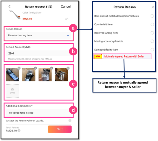 拒绝退货–如果您的退货请求中没有足够的证据或索赔不合理,卖家可以拒绝您的退货申请。当您的返回被拒绝时,您可以与Lazada进行争执,以寻求解决方案。